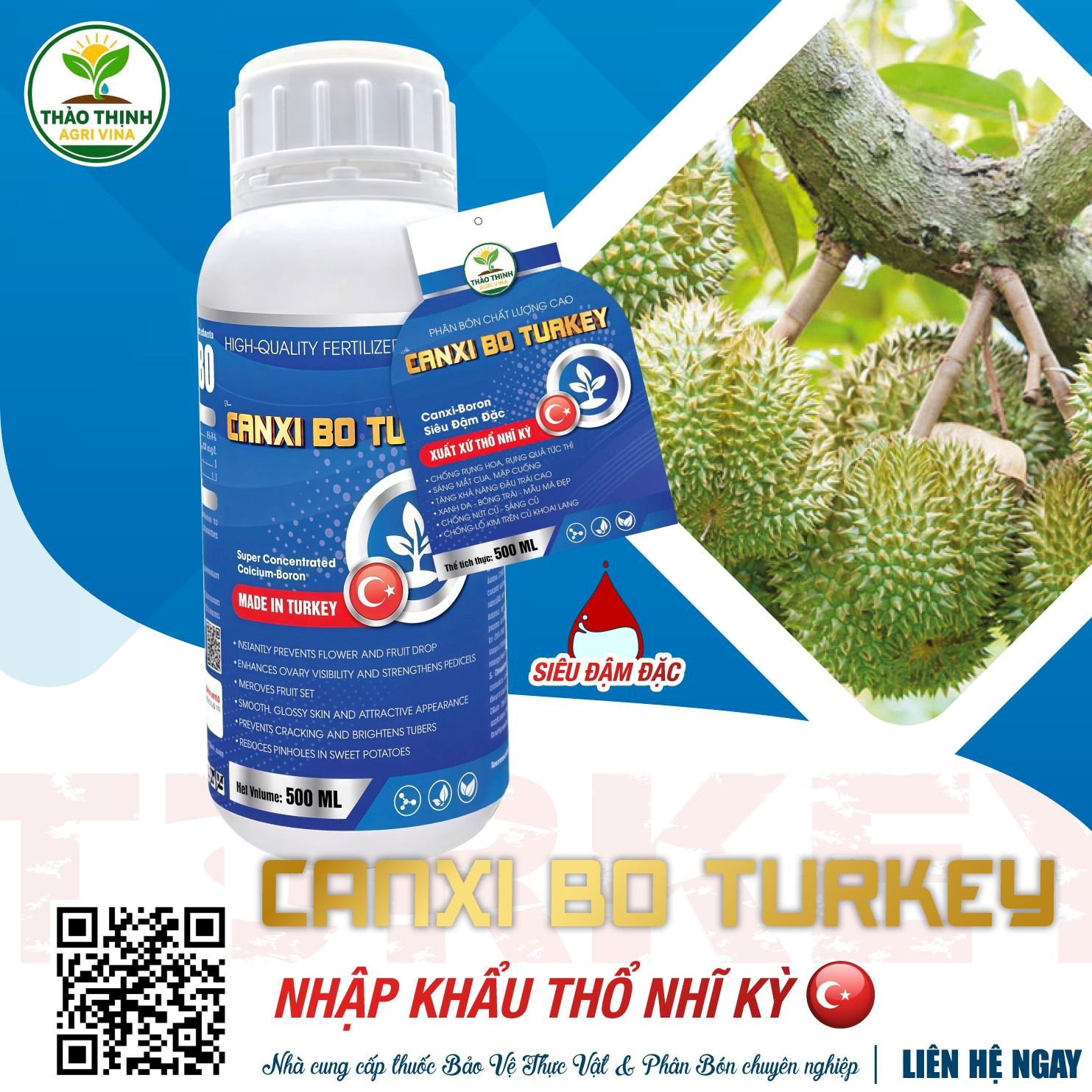 Để hạn chế tình trạng rụng hoa và rụng trái non trên sầu riêng, nhà vườn cần chú trọng bổ sung dinh dưỡng giúp cuống hoa, cuống trái chắc khỏe và tăng khả năng giữ trái. Sản phẩm Canxi Bo Turkey từ Thảo Thịnh Agri Vina là sản phẩm nhập khẩu từ Thổ Nhĩ Kỳ, với hàm lượng Canxi Bo siêu đậm đặc, giúp tăng độ bền thành tế bào, làm chắc cuống và hạn chế hình thành tầng rời.