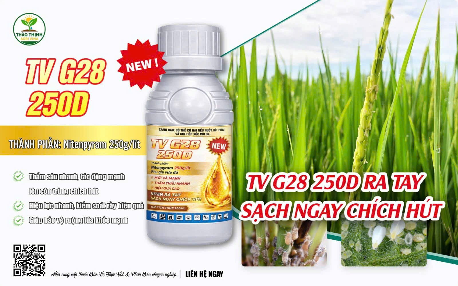 Để kiểm soát rầy nâu hại lúa hiệu quả, bà con cần áp dụng biện pháp hóa học đúng thời điểm, đặc biệt khi rầy mới xuất hiện hoặc mật số bắt đầu gia tăng trên đồng ruộng. Hiện nay, Thảo Thịnh Agri Vina đã có TV G28 250D với hoạt chất Nitenpyram 250g/lít, là giải pháp phù hợp giúp phòng trị rầy nâu nhanh và hiệu quả. Sản phẩm có khả năng thấm sâu nhanh, tác động mạnh lên nhóm côn trùng chích hút, giúp hạ rầy nhanh, kiểm soát mật số tốt và hạn chế nguy cơ lây lan trên diện rộng. Nhờ hiệu lực mạnh và tác động nhanh, TV G28 250D góp phần bảo vệ cây lúa khỏe mạnh, giảm thiểu thiệt hại do rầy nâu gây ra, từ đó hỗ trợ duy trì năng suất và hiệu quả canh tác cho bà con.